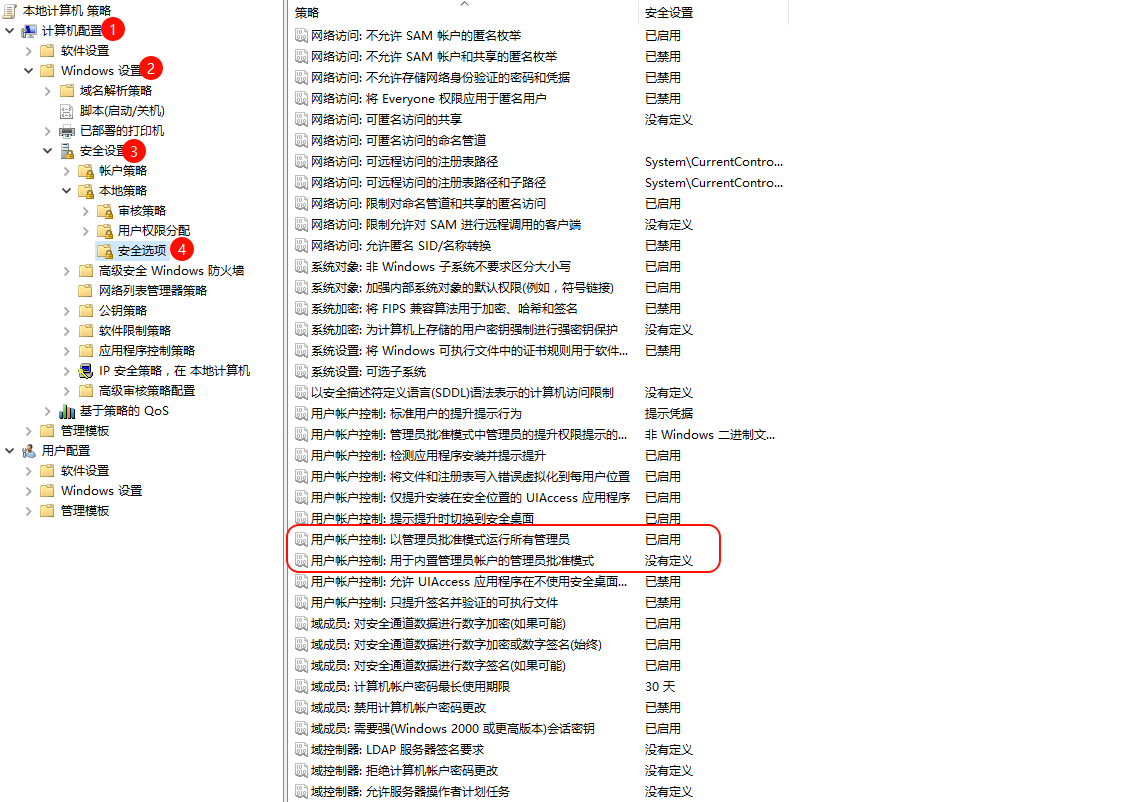用户账户控制 以管理员批准模式运行所有管理员/用于内置管理员账户的管理员批准模式 调整好后注销重新登录即可